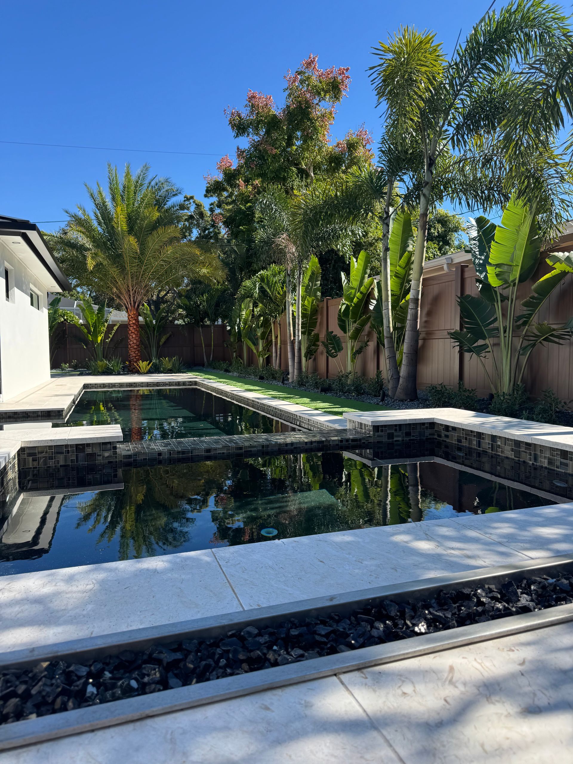 This Belleair, FL project highlights Southern Brothers Landscape Design’s expertise in creating clean, modern outdoor environments through thoughtful landscape and turf installation. The team enhanced the property with vibrant tropical plantings, including palms, to frame the pool and add lush privacy along the fence line. Premium artificial turf was installed throughout key areas of the yard, providing a low-maintenance, visually polished surface that pairs seamlessly with the home’s contemporary architecture. Accents like black rock beds and neatly arranged greenery complete the design, resulting in a cohesive, resort-inspired landscape that elevates the outdoor space without altering its existing structures.